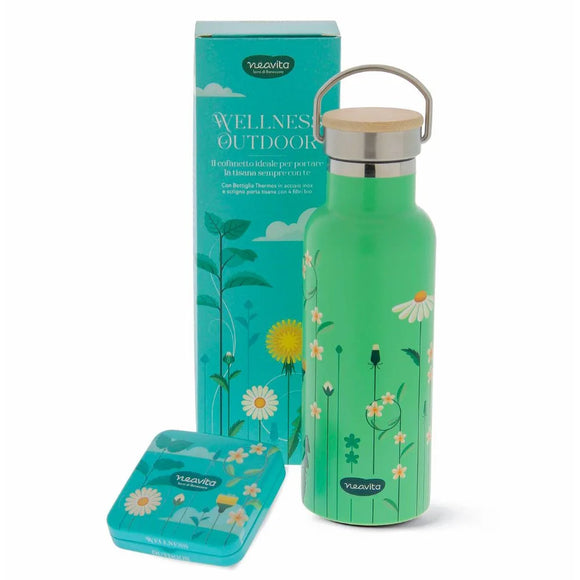 Il cofanetto Wellness Outdoor Neavita è perfetto per godersi il momento della tisana in ogni momento, anche all'aria aperta. Contiene una bottiglia Thermos in acciaio inox che mantiene la tisana sempre alla giusta temperatura, calda o fredda, accompagnata da uno scrigno in latta contenente 4 filtri Bio per tipo di: